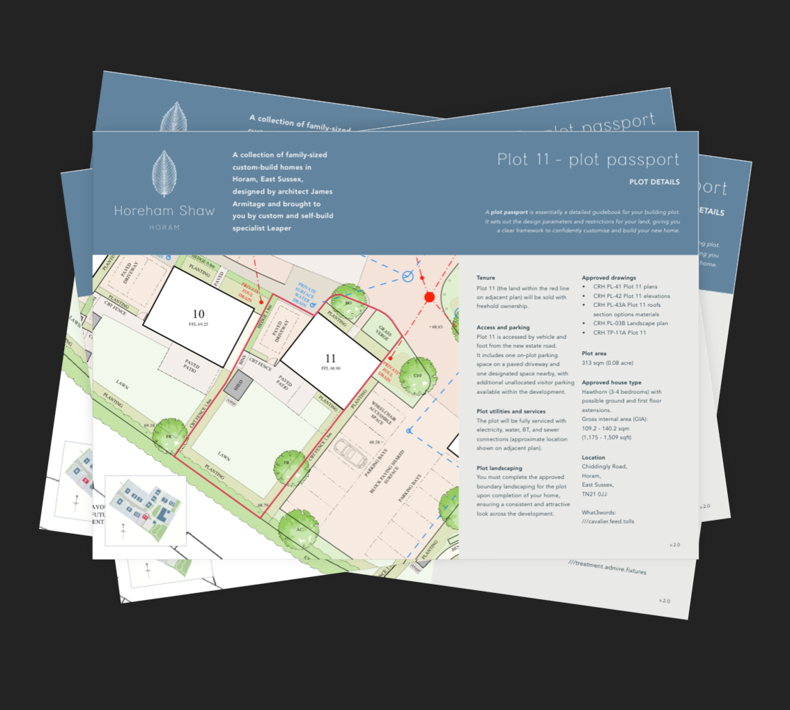 Twelve serviced building plots with planning permission for thoughtfully designed three- to five-bedroom family homes, along with six one- and two-bedroom affordable flats, all created by renowned architect James Armitage—in the heart of East Sussex.