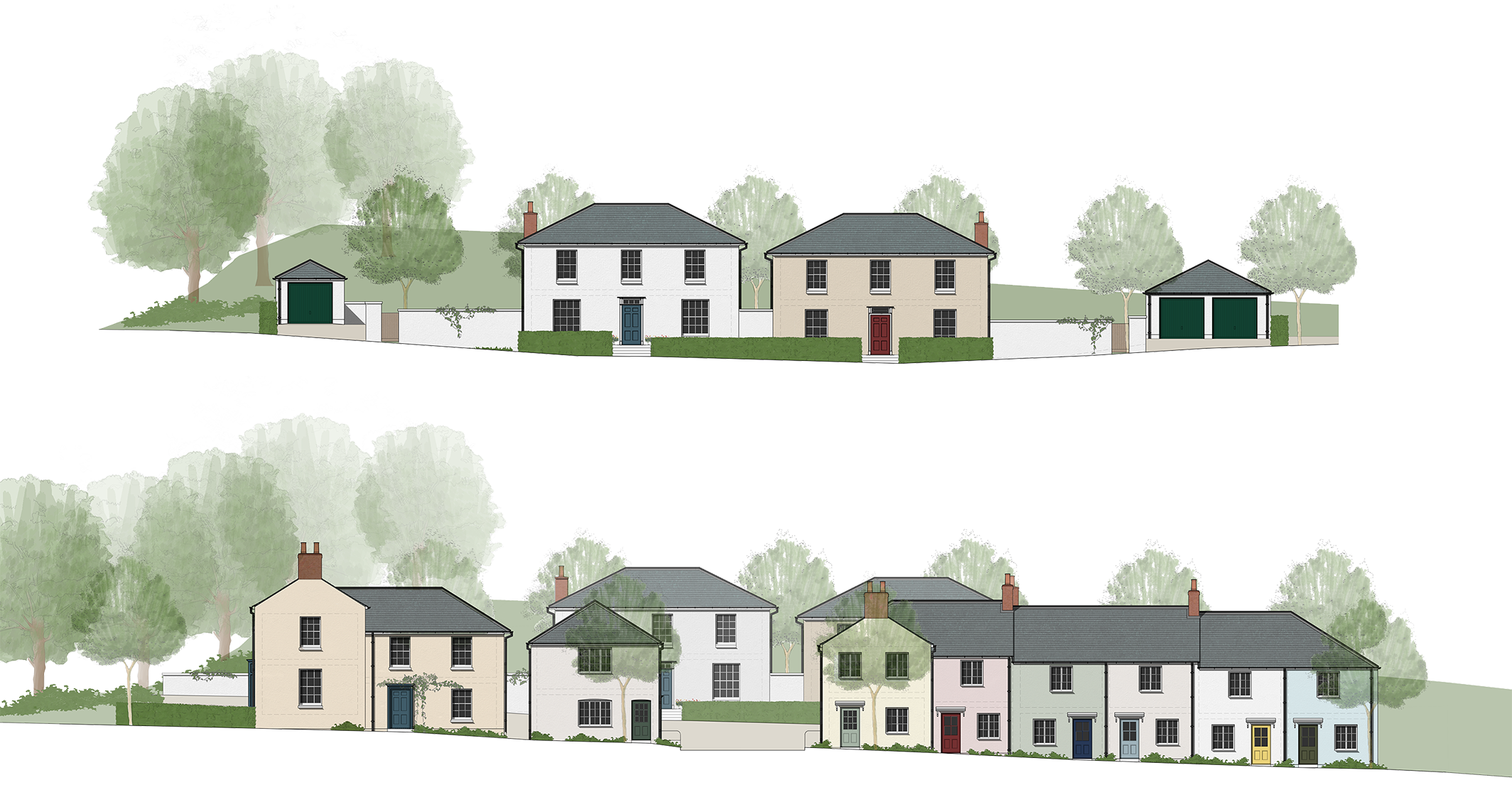 The homes draw on the charm of Uplyme’s cottages and houses, combining smaller terraced homes with wider-fronted dwellings. Materials will include local stone, coloured render, and slate-style roofs, with chimneys contributing to a familiar village roofscape.