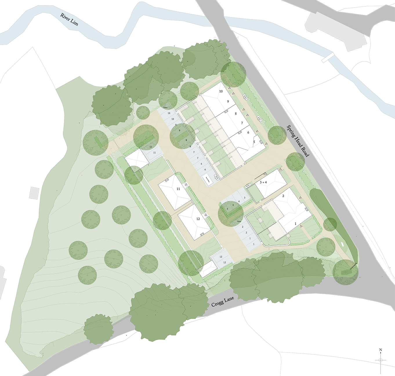Our proposed development, designed by renowned architect Ben Pentreath, at Crogg Lane sits on the edge of the village, where Spring Head Road meets Crogg Lane. The River Lim runs along the northern boundary, framed by mature trees, creating a natural and peaceful setting.
